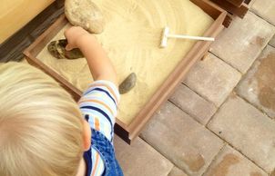 Does your child need more meditation and relaxation? Yes, that IS a miniature rake. And yes, that two year old is arranging the rocks in a balanced and peaceful Japanese rock garden.